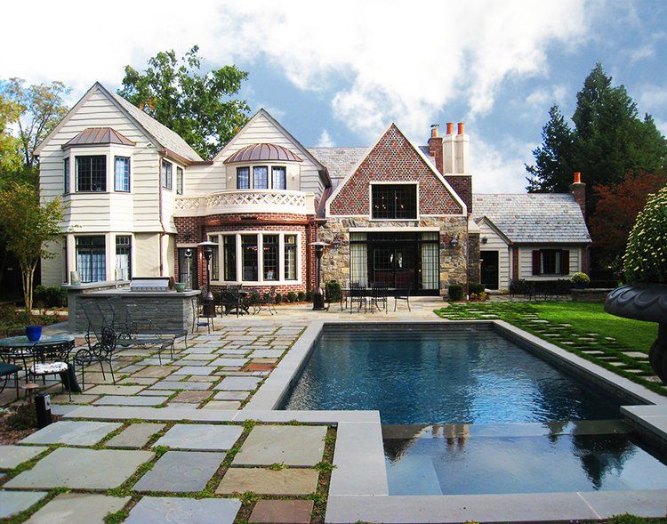 His Tudor renovation is magnificent! He kept all of its charm and important Tudor details, while opening up its confining rooms and narrow doorways. The varied siding is gorgeous, the outdoor fireplace is inviting, the curved wall in the dining room is gracious and the pitches in the roof offer a soaring presence. He maintains all the elements that make a historic property so interesting (as well as emphasizing all that are hidden with age and design) and gives it a contemporary and warm aesthetic perfect for a modern lifestyle.”